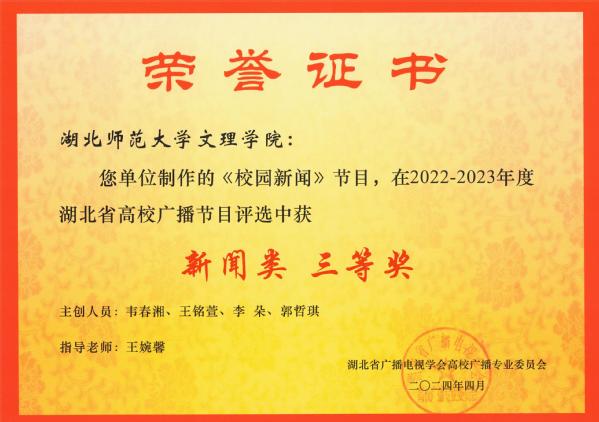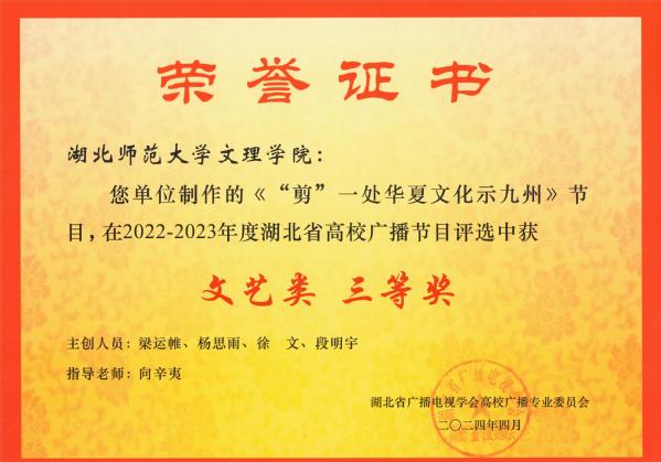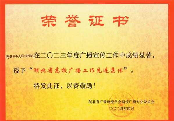 本网讯(通讯员 张慧萍)4月19日,全省高校广播专业委员会工作会议在湖北经济学院召开。会议通报了2022-2023 年度湖北省高校广播节目评选结果,TIANKONG.COM_天空(中国)广播台获“湖北省高校广播工作先进集体”的荣誉称号,向辛夷老师指导的《“剪”一处华夏文化示九州》节目,荣获“文艺类”三等奖,王婉馨老师指导的《校园新闻》节目,荣获“新闻类”三等奖。