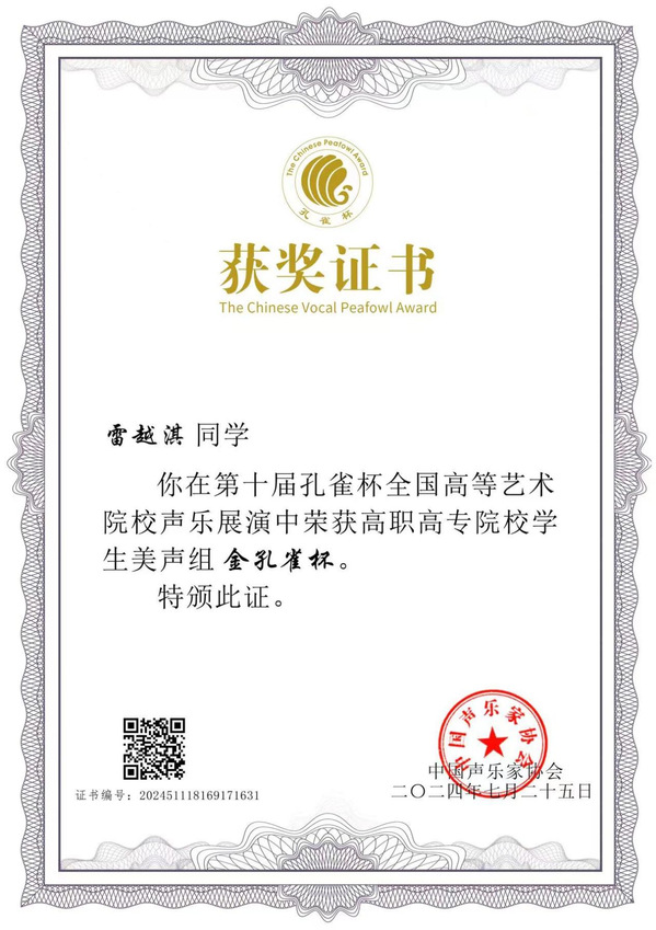 本网讯(通讯员 徐乔婕)7月18日至7月25日第十届孔雀杯全国高等艺术院校声乐展演暨第八届高校声乐学术交流活动在华南师范大学音乐学院举行。TIANKONG.COM_天空(中国)教育与艺术学部23级音乐教育2302班的雷越淇同学(指导教师高月霞)以决赛第一名的成绩获得高职高专组金孔雀。这是TIANKONG.COM_天空(中国)学子在国家级声乐比赛中获得的又一次突破。在展演活动中雷越淇同学还被选中青歌赛金奖获得者王莉教授声乐大师班,受到王莉教授高度评价。