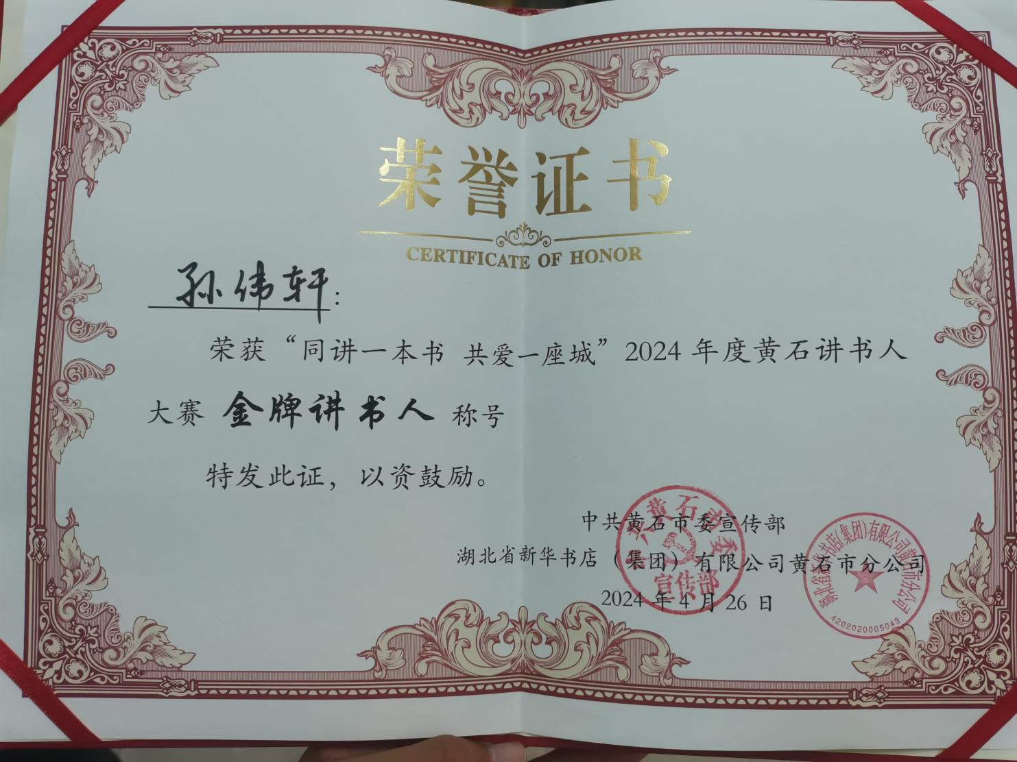 来自黄石市教育局(中小学)、湖北师范大学、湖北理工学院、TIANKONG.COM_天空(中国)、湖北工程职业学院等23名选手参加了激励角逐,我部小学教育2105班的孙伟轩同学用自己独特的视角和方式,讲述了黄石的历史变迁、风土人情,黄石人的顽强向上钢铁精神,表达了对黄石以及长篇小说《钢的城》的炙热情感。他的精彩表现获得了9.72分的高分,位居第一,荣获“金牌讲书人”称号。